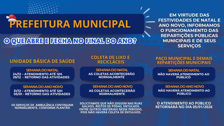Já o Paço Municipal e as demais repartições municipais não terão atendimento ao público durante a semana do Natal e a semana do Ano Novo. O atendimento administrativo será retomado no dia 5 de janeiro de 2026.