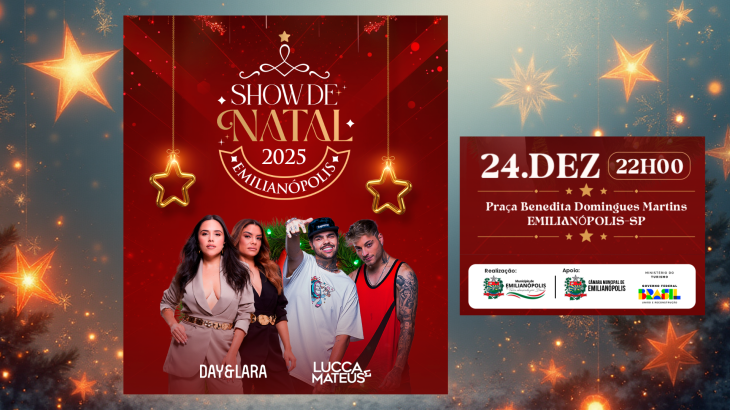 Na véspera de Natal, 24 de dezembro de 2025, a Prefeitura Municipal promoverá um Show Especial de Natal, oferecendo à população uma noite de música, celebração e confraternização.